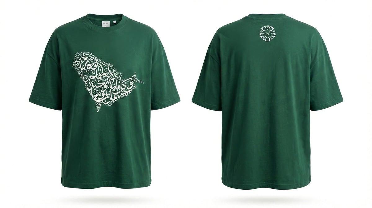 تيشيرت أخضر بتصميم فريد بالخط العربي نحتفل فيه بيوم التأسيس العظيم للمملكة العربية السعودية ببيت شعر وطني ( صعبةً أفعالنا لابغاها غيرنا وكملة التوحيد حنا عمار رسومها ) من القصيدة المشهورة.